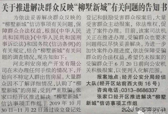 河北利安房地产开发有限公司在未办理任何手续的情况下,开始向不特定人群出售房屋。大量群众因不了解详细情况,认购了“柳墅新城”的房屋,受到严重欺骗。张家口经开区推进解决“柳墅新城”信访事项工作组于2019年10月30日-11月22日通过设立登记处登记和鼓励受害群众报案后,大量受害群众主动报案,依法维权,促进了案件办理。目前,该案司法机关正在推进办理,受骗群众也要求问题得以尽快妥善解决。为进一步加快案件办理进度,依法保障受骗群众的合法权益,希望仍未报案的受骗群众于6月20日前向公安机关积极报案,以便列入化解范围。